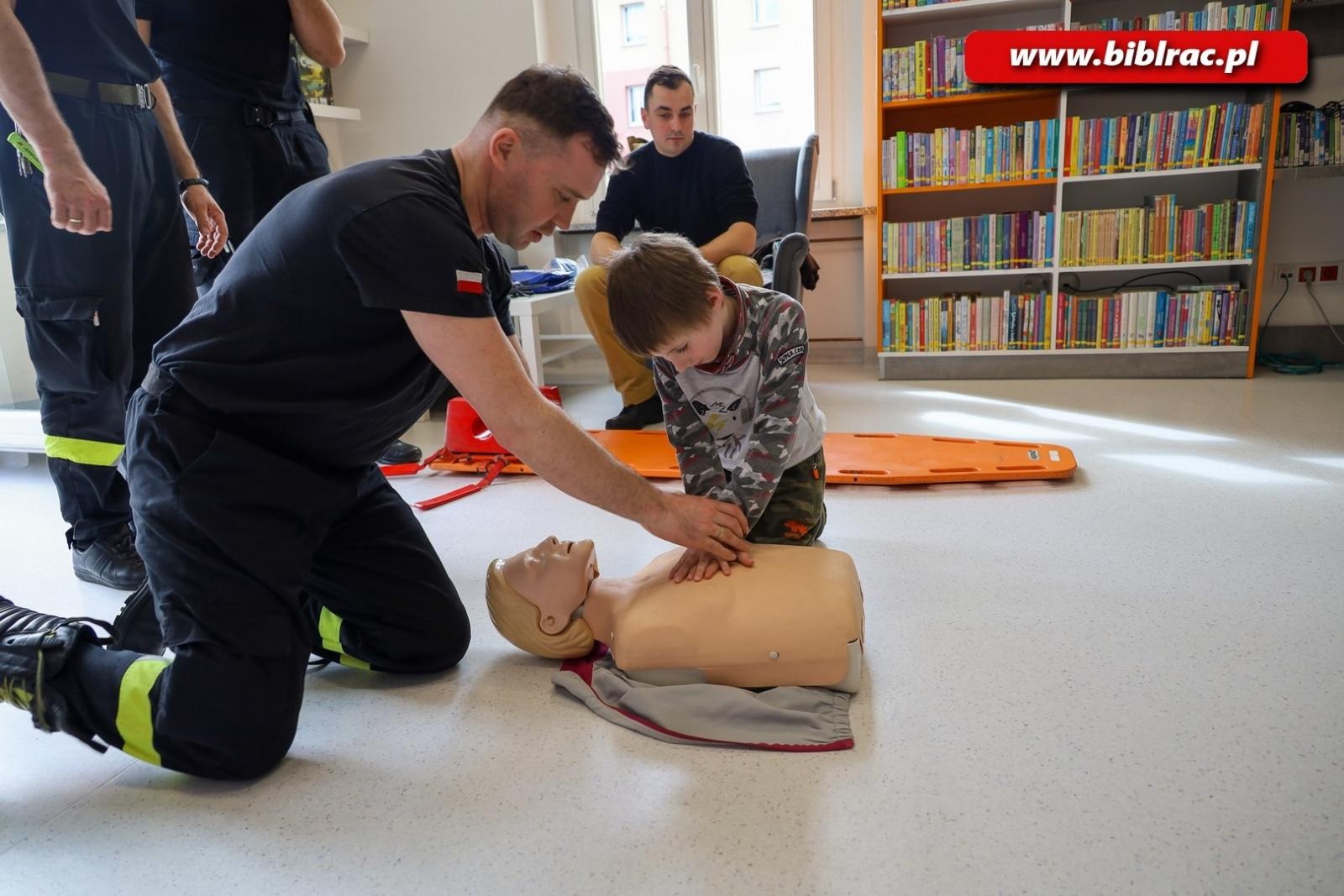 Strażacy pokazali swój sprzęt ratowniczy i zademonstrowali udzielanie pierwszej pomocy przedmedycznej osobom poszkodowanym, zarówno dorosłym jak i dzieciom oraz pokazali zasady obsługi defibrylatora AED, który znajduje się w Wypożyczalni Głównej.